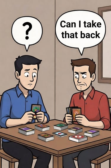 I specifically, since being back, have really only played in Lackey Grand Prixs. I've asked to take stuff back several times, probably every game to be honest. In my opinion, I think tournaments like this, Locals, Districts should allow for minor take backs without a big issue. That being said, once you get to State level and above I think take backs should not be allowed at all. Once a card is played, even if it does nothing because something on the board is negating or protecting against it, it goes to discard. Getting to Nationals and staying in a Hotel can be pricey. Although we need to show grace and mercy as a Christian card game, I think we need to respect the time and effort people put into the game and especially the cost of making these higher level tournaments. Now..... if you are in round 1 playing against a child or someone super new to the game, I don't think it needs to be set in the rules to show them a little grace. If you know you are going to 5-0 or 5-2 someone with ease, give them grace. If you are playing against a top player, the top player vs top player should not allow take backs (unless the person agrees to it).