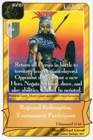 If no opponent has a lost soul in his territory, you may make a "Taunt battle challenge" with an evil character that has a Taunt identifier. A taunt battle challenge is done by placing the evil character into battle and declaring an opponent. The opponent may accept the Taunt battle challenge by placing a Hero into battle to fight the evil character. If the evil character wins the Taunt battle challenge, activate the special ability in the parentheses after the Taunt identifier. If the battle challenge is declined the taunt ability works.